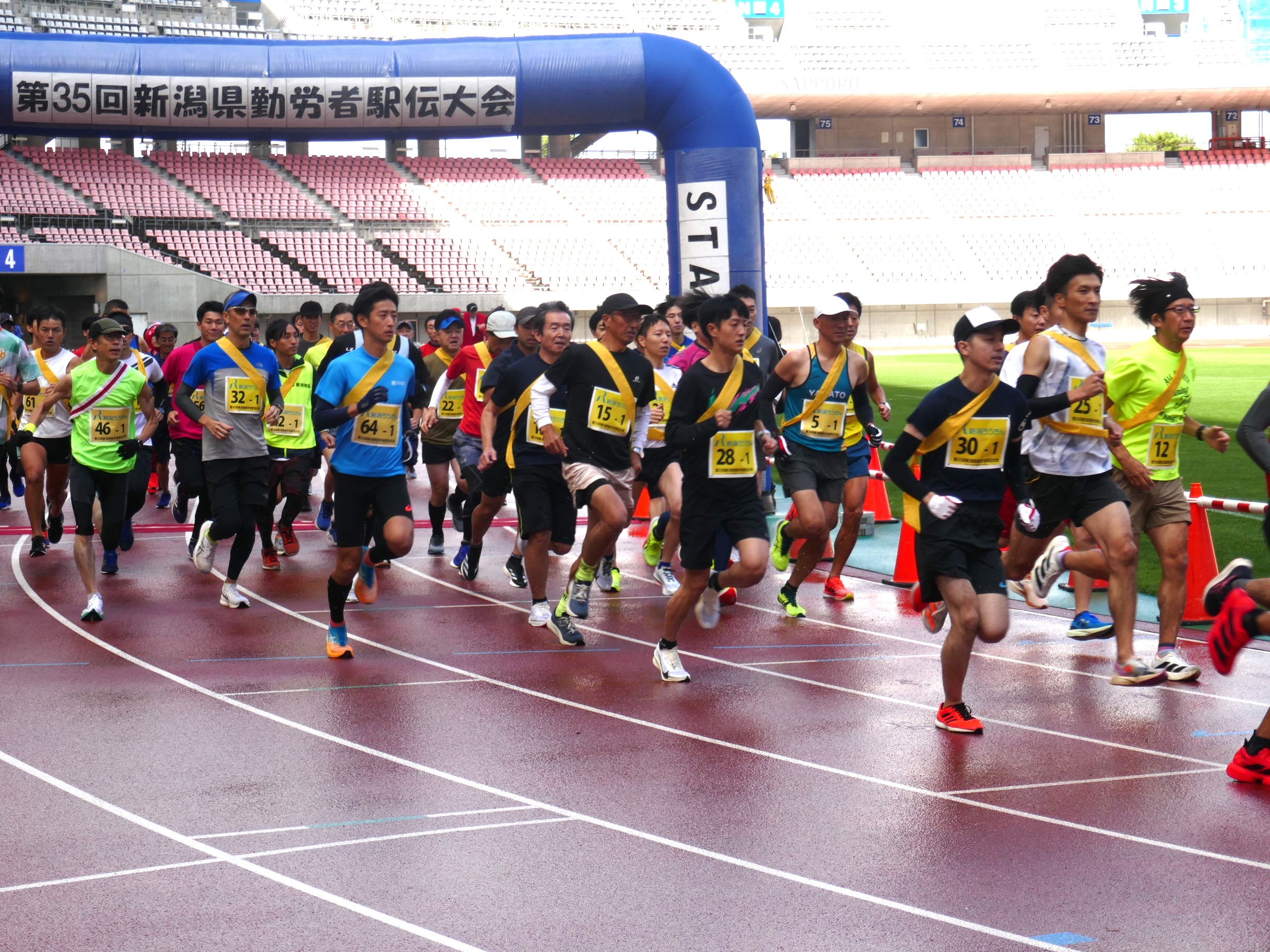 11月3日(月)、雨が心配される中で連合新潟・労福協主催の第35回新潟県勤労者駅伝大会が、新潟市デンカビッグスワンスタジアムをスタート・フィニッシュとし新潟県スポーツ公園内コース(6区間18.4㎞)で開催されました。